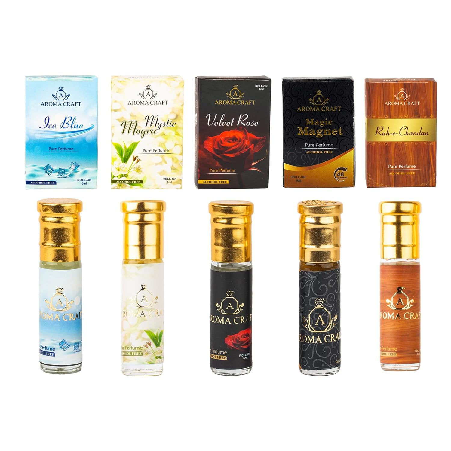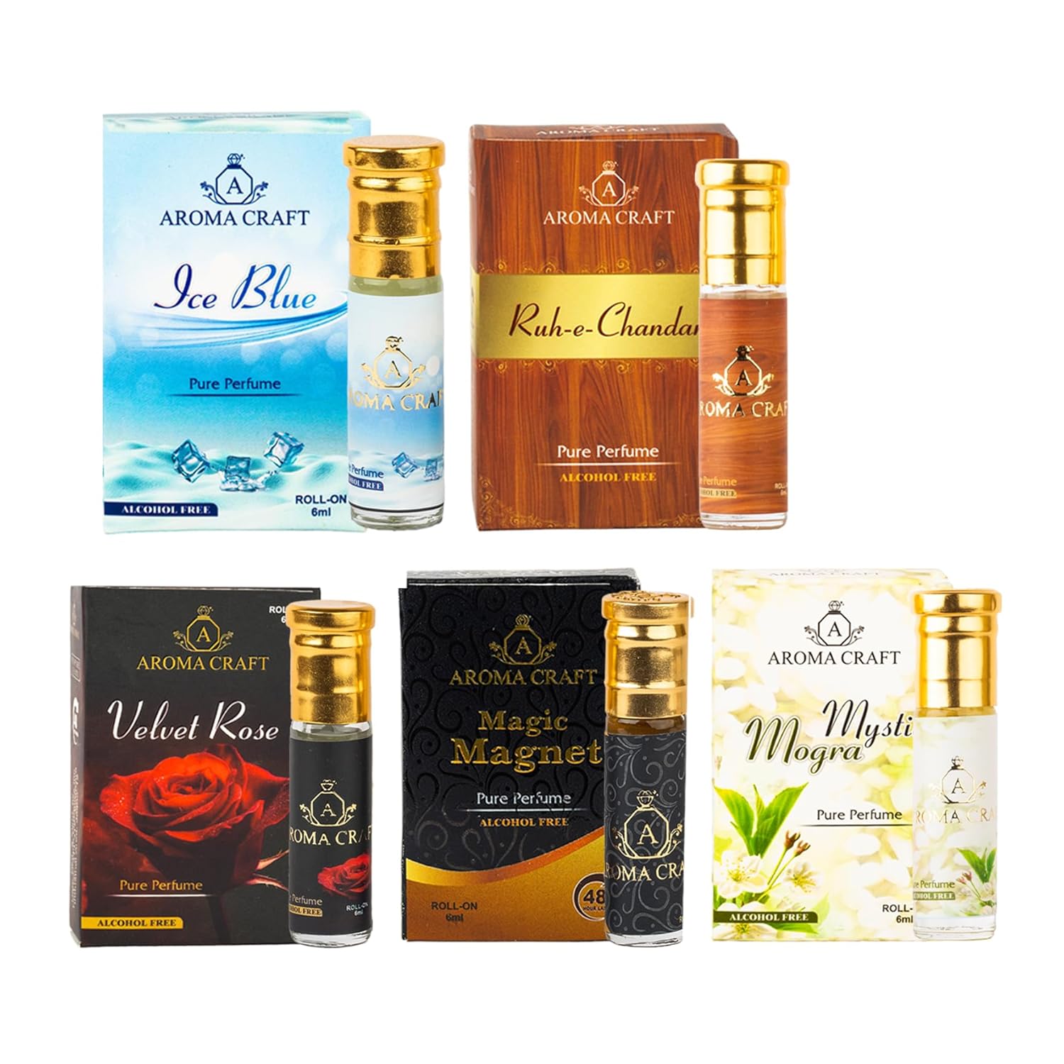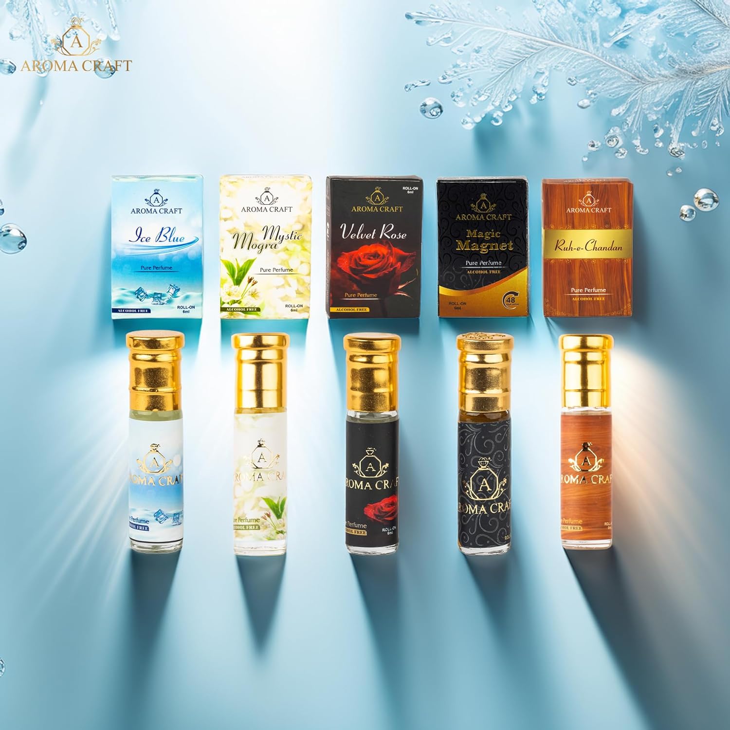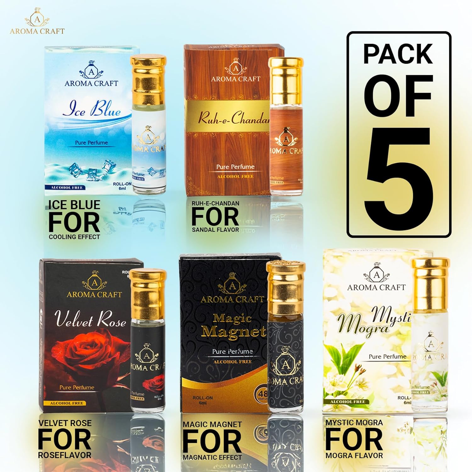 Aroma Craft Luxury Attar Pack of 5 (6ml Each) is an exquisite collection of premium non-alcoholic roll-on perfume oils, carefully curated to bring you a divine blend of tradition, luxury, and long-lasting fragrance for every occasion. This elegant set includes five unique scents—Ice Blue with its refreshing and soothing aquatic floral notes, Ruh-E Chandan offering the calming, earthy richness of pure sandalwood, Velvet Rose capturing the timeless romance of blooming roses, Magic Magnet with its exotic, magnetic aroma for special moments, and Mystic Mogra, a delicate and enchanting white floral essence that evokes serenity and grace. Crafted with pure, natural ingredients, these attars are alcohol-free, skin-friendly, and designed for men and women who appreciate elegance and sophistication in their daily wear, festive occasions, meditation, or prayer rituals. Each 6ml roll-on bottle is compact, travel-friendly, and easy to use, making it perfect for personal use or as a thoughtful luxury gift for your loved ones. Whether worn individually or layered to create your own signature scent, this attar pack delivers a rich, long-lasting aroma that lingers gracefully, enhancing your presence with a touch of timeless charm and spiritual purity.